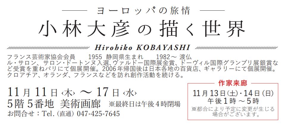 ヨーロッパの街々が持つ古い歴史と文化、そして美しい自然と調和に魅せられて渡仏した小林大彦。欧州でも高い評価を受けた豊かな感性と描写で叙情あふれる作品です。油彩と水彩の作品を約30点ほど展示いたします。