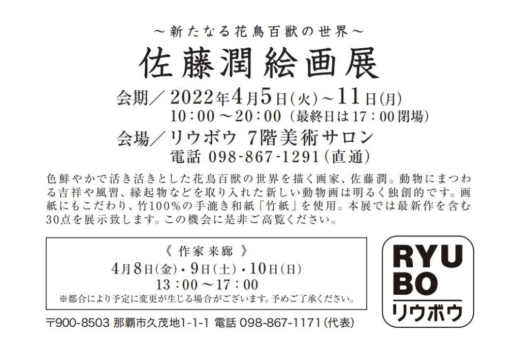 色鮮やかで活き活きとした花鳥百獣の世界を描く画家、佐藤潤。動物にまつわる吉祥や風習、縁起物などを取り入れた新しい動物画は明るく独創的です。画紙にもこだわり、竹100%の手漉き和紙「竹紙」を使用。本展では最新作を含む30点を展示致します。この機会に是非ご高覧ください。