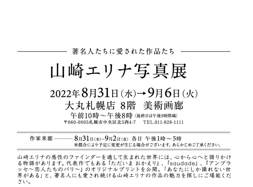 山崎エリナの感性のファインダーを通して生まれた世界には、心から心へと語りかける物語があります。代表作でもある『ただいまおかえり』、『saudade』、『アンブラッセ~恋人たちのパリ~』のオリジナルプリントを公開。「あなたにしか撮れない世界がある」と、著名人にも愛され続ける山崎エリナの作品の魅力を探しにご堪能くだ