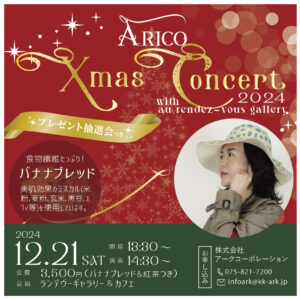 news 2024年11月20日 Arico Xmas コンサート 開催✨ 2024年12月21日(土) 13:00~よりピアニストAricoさんによるピアノコンサートを開催いたします🎄 師走そしてXmas 。 一年を締めくくるドラマティックな季節にお聴きいただきたいエモーショナ […]