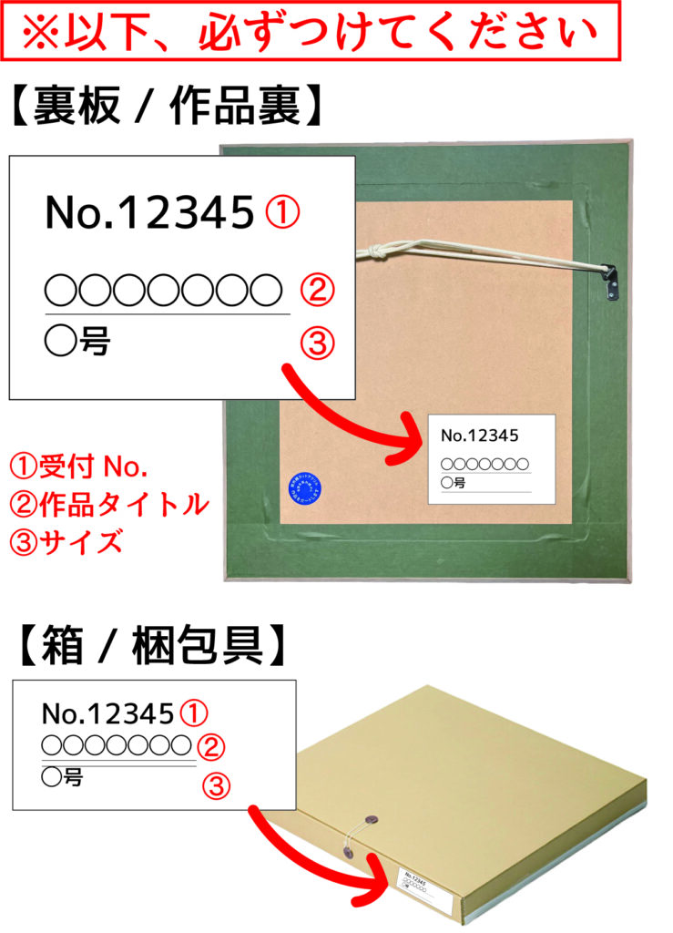 作品裏と箱に以下添付いたしました形式で貼り付けをお願いしております。