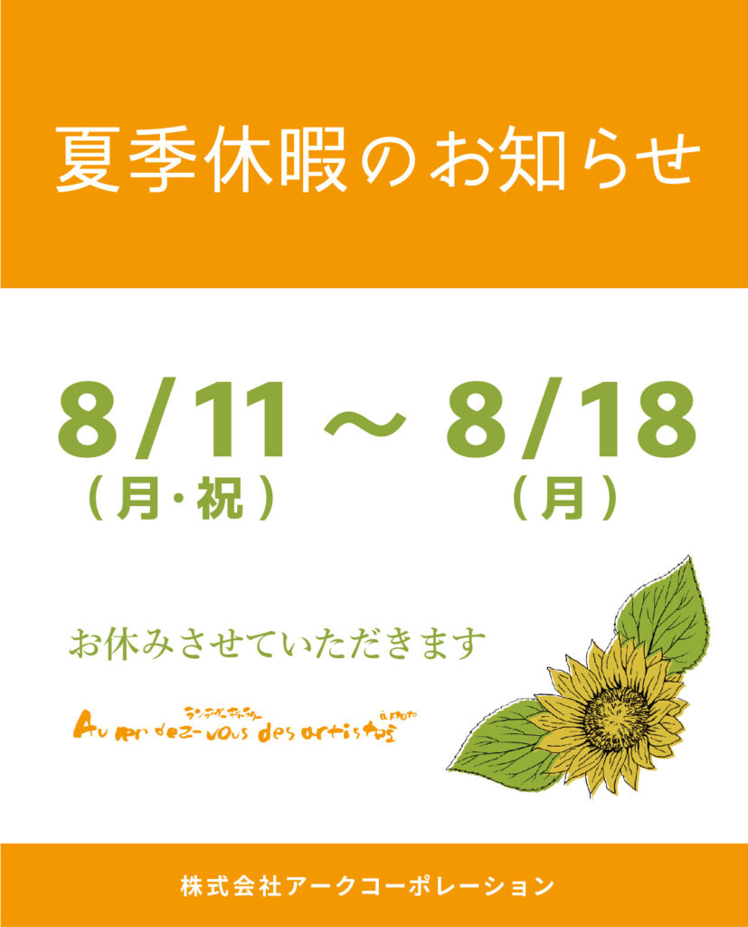 news 夏季休暇のお知らせ いつもランデヴーギャラリー&カフェをご利用いただき、ありがとうございます。2025年 8 月 11日(月・祝)〜2025年 8月 17日(日)は夏季休暇のため休廊させていただきます。