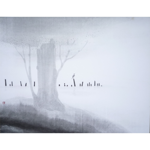 自然や街を題材にした濱中応彦の水墨画は、風のそよぎまで伝わってきそうな静かな世界が広がる。