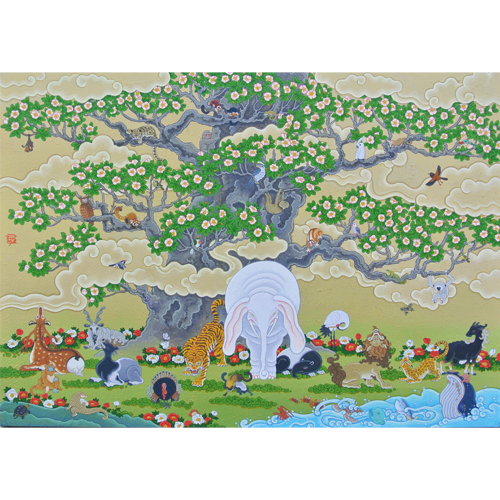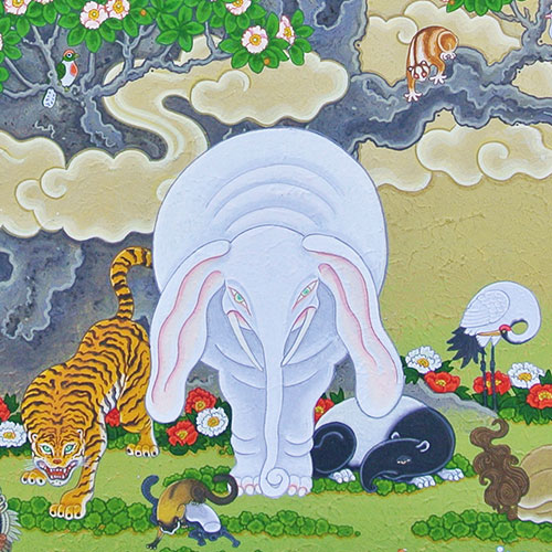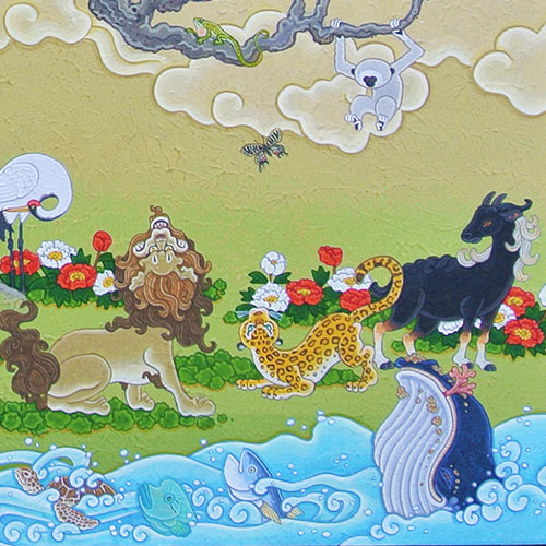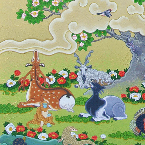 手漉きの竹紙に絶滅危惧種や吉祥にまつわる動物たちを美しく描く