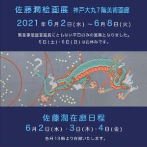 緊急事態宣言延長に伴い、平日のみの絵以上となりました。作家来場予定であった6月5日(土)・6日(日)はお休みとなりますので、以下のとおり、作家来場を変更致します。 大丸神戸店 佐藤潤絵画展 佐藤潤在廊日程6月2日(水)・ […]