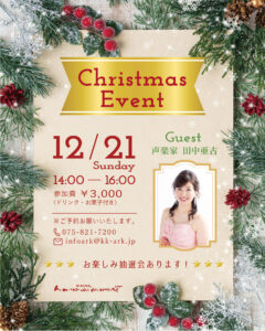 Christmas Event ☆Guest 声楽家: 田中 亜古 参加費:3,000円 (ドリンク・お菓子付き) 可愛らしい作品に包まれながら、心温まるひとときを過ごしませんか? 季節に寄り添う音楽やクリスマスソング […]