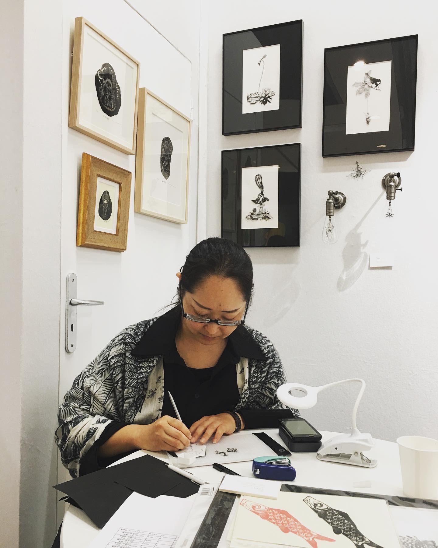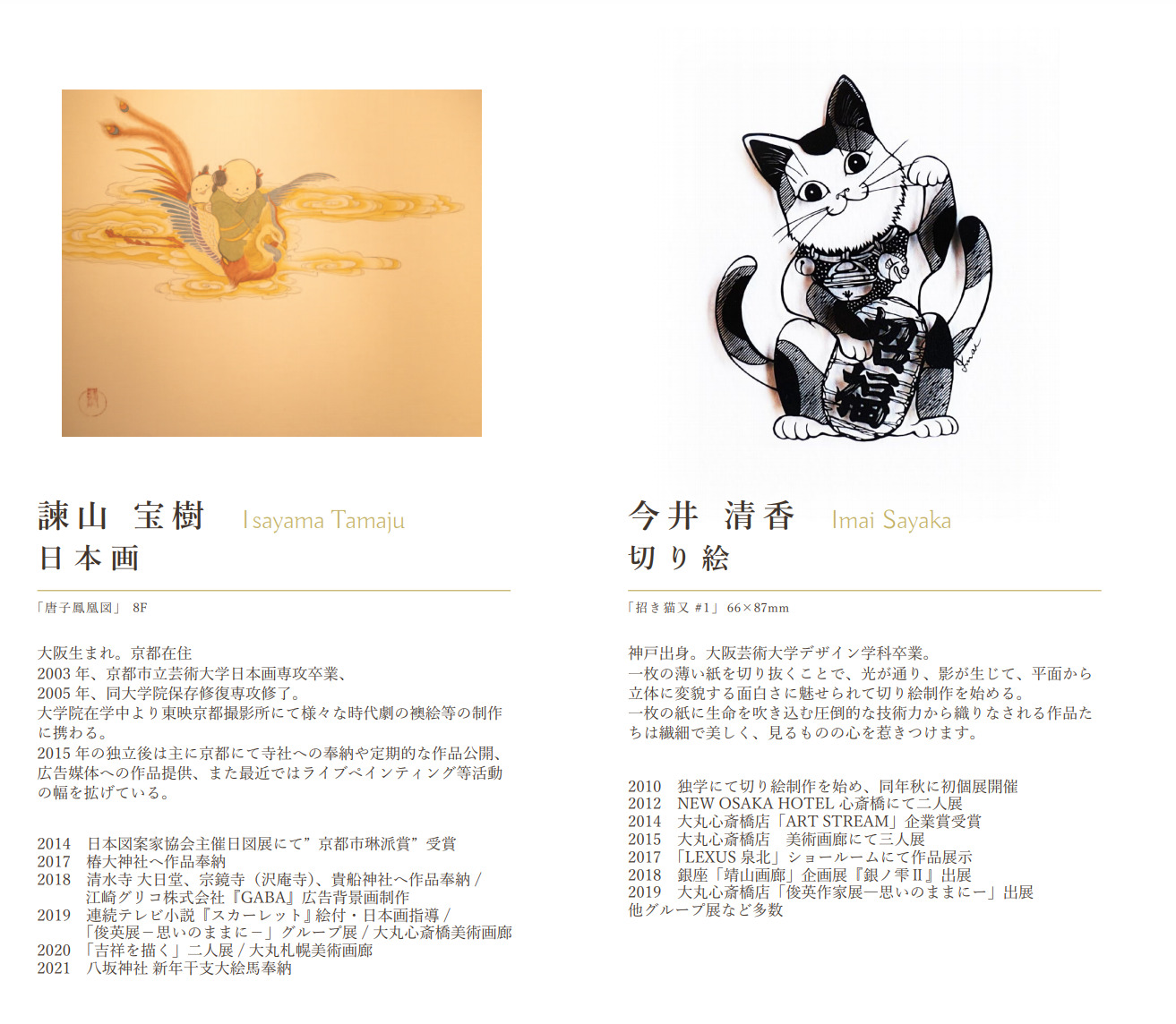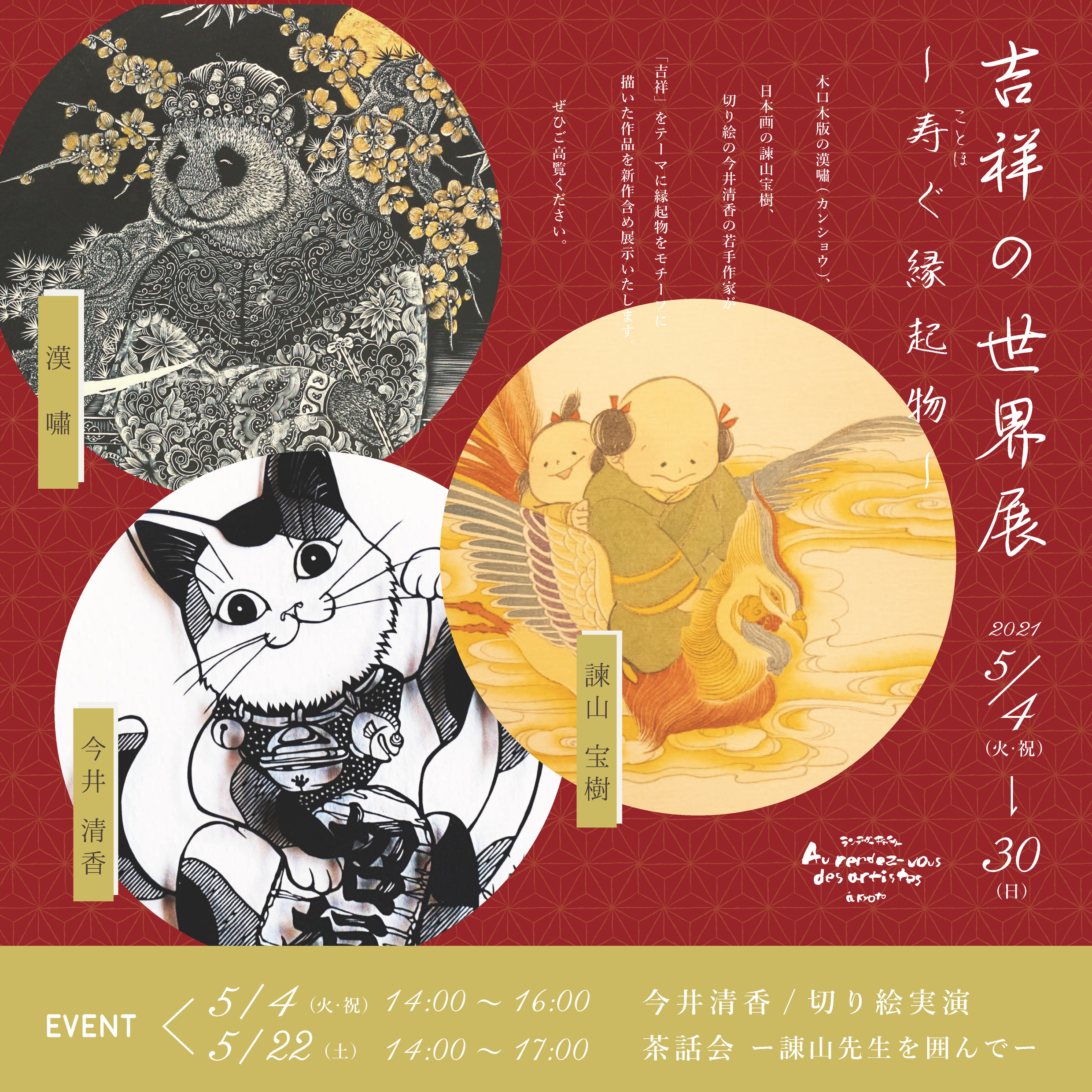 木口木版の漢嘯(カンショウ)、日本画の諫山宝樹、切り絵の今井清香の若手作家が「吉祥」をテーマに縁起物をモチーフに描いた作品を新作含め展示いたします。ぜひご高覧ください。
