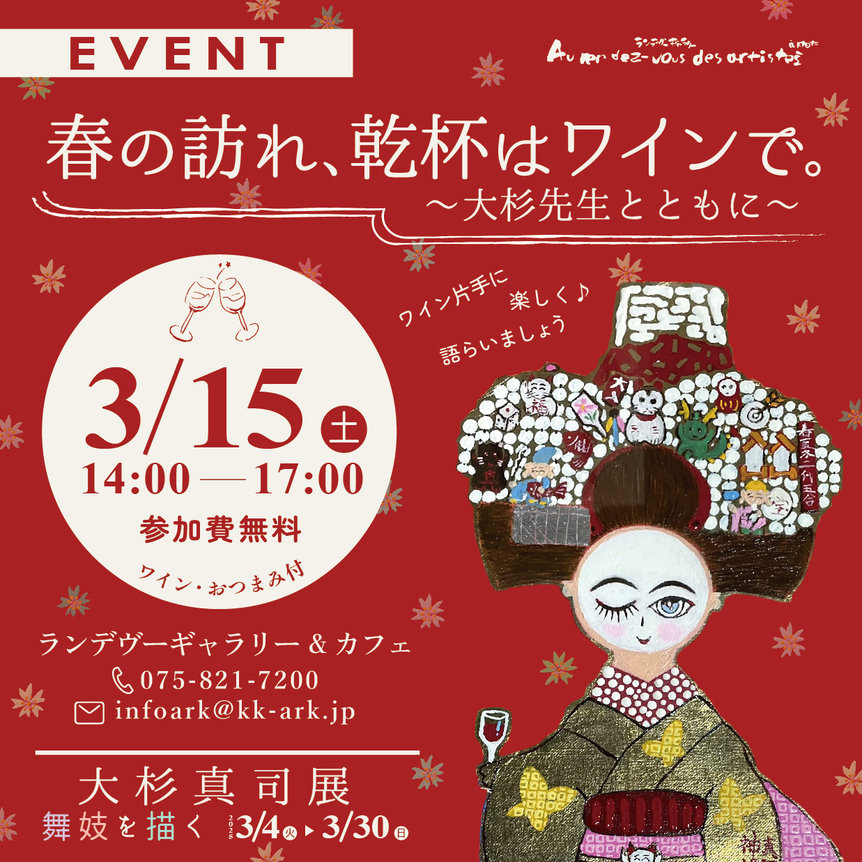 作品の中で、ワインを嗜む舞妓の姿がたびたび描かれます。 大杉先生と絵の中の舞妓と共に、ワイン片手に楽しく語らいましょう。 お気軽にお越しください。